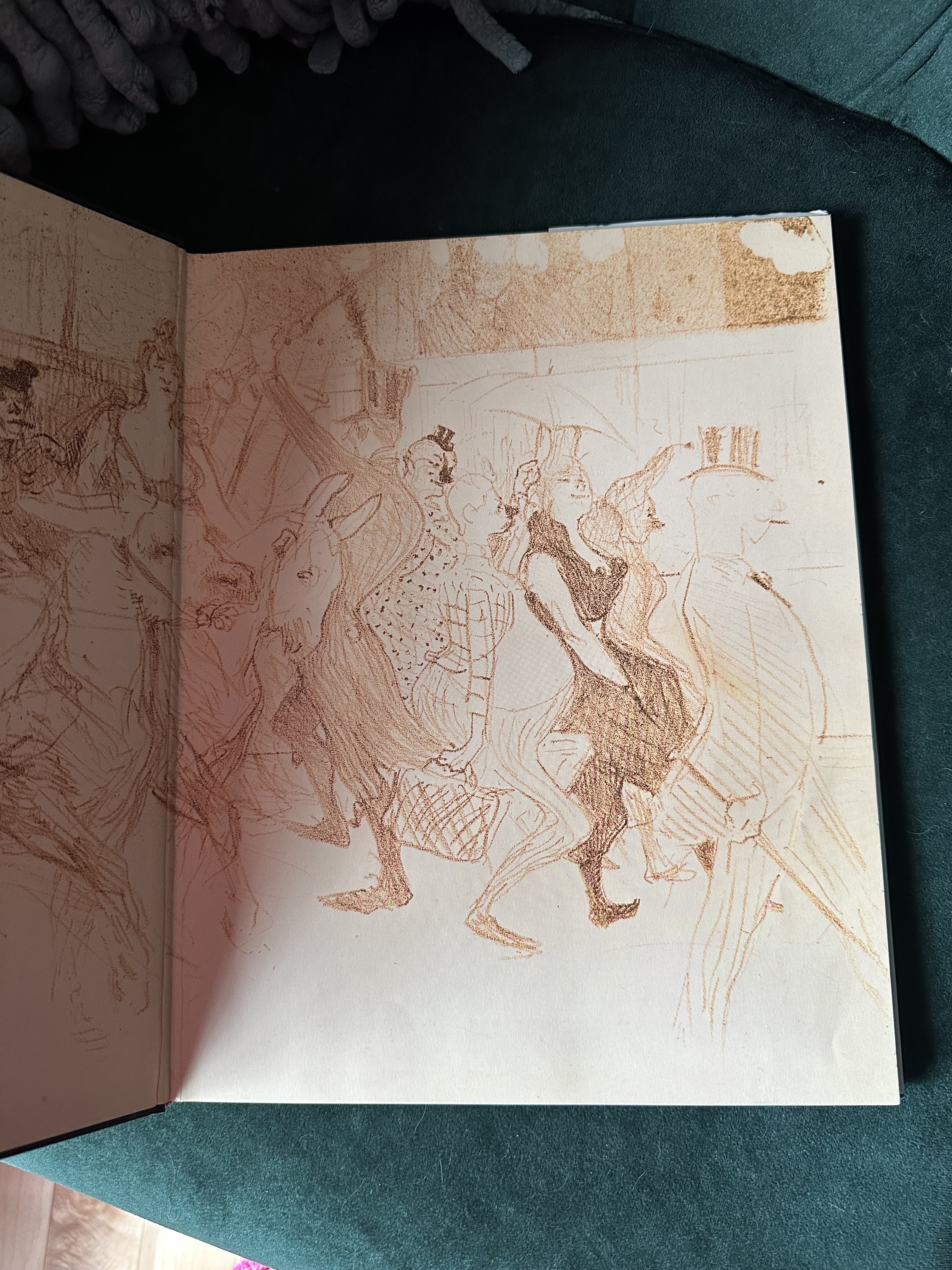 I ran and grabbed my old Toulouse Lautrec coffee table book to show him, the one I had bought back in the 90’s long before we all had tiny libraries in the form of a phone in our hands.