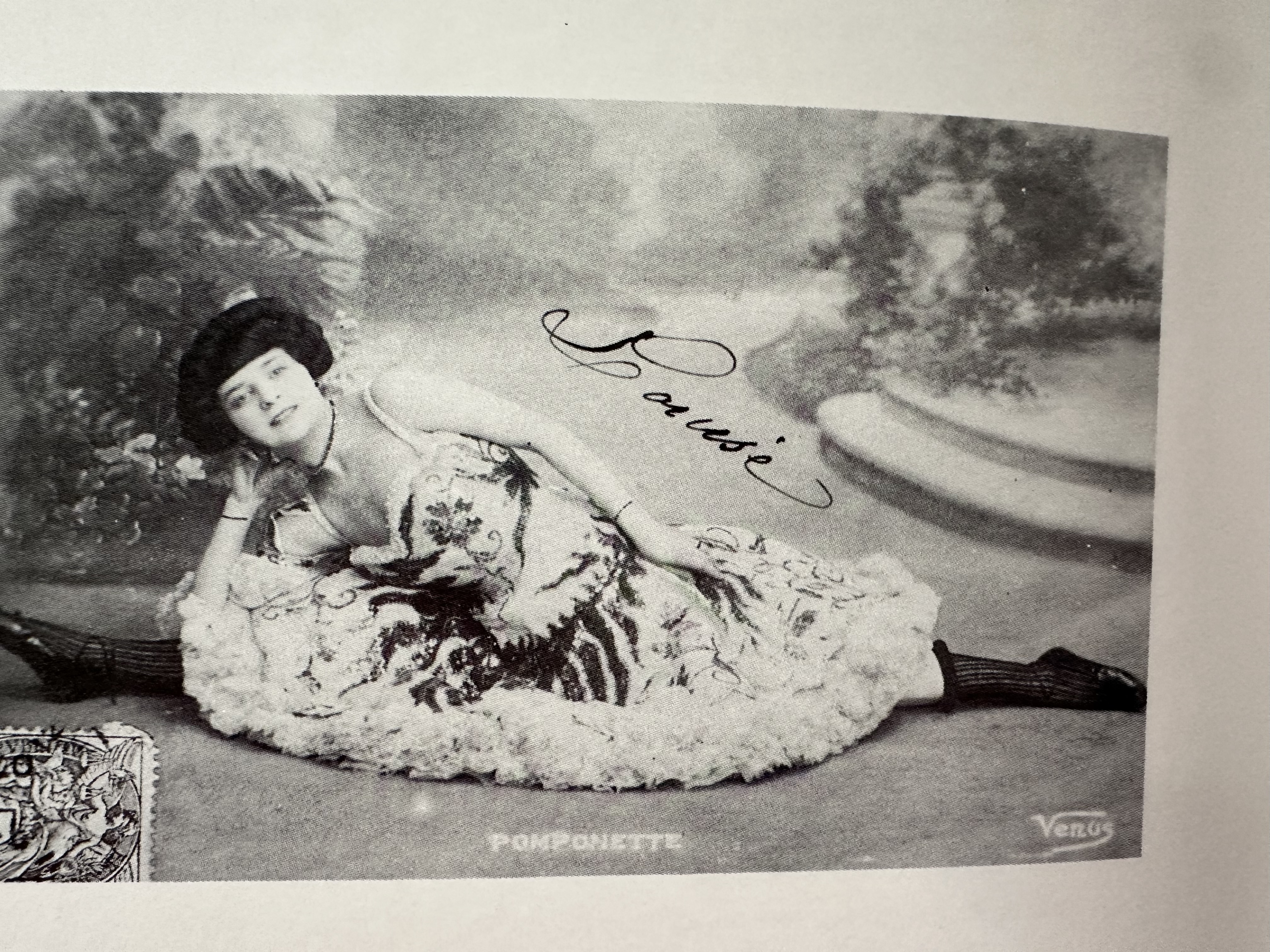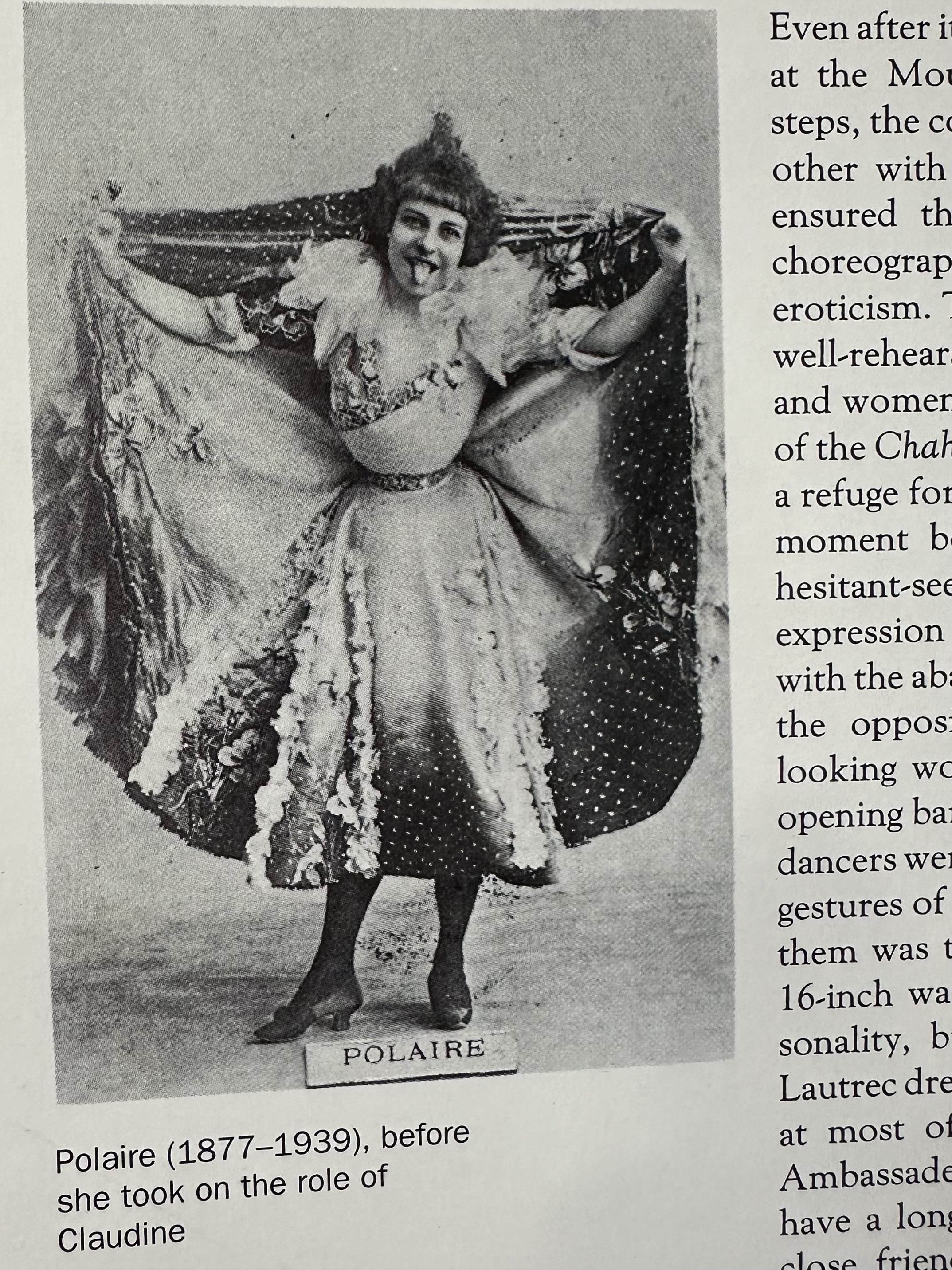There was Toulouse in his boa, the story of his childhood accident that stunted his legs, and the place he found home–the Moulin Rouge, where the dancers and theater folk took him in and loved him, the place I loved most—the place of the theater folk. There were the dancers, La Goulue, Mistinguett, names long forgotten and unknown to most, but as familiar as old friends to me.